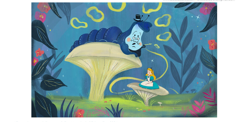 Il suo amore per le matite colorate, la natura e le storie si nota in ogni suo tratto: colori pastello e linee morbide dipingono mondi abitati da personaggi sempre felici, in pace con se stessi, con la natura tutta. Se dovessi dire perché ho scelto proprio lei, risponderei immediatamente che, soprattutto in questo momento, vivrei volentieri dentro le sue illustrazioni, in mezzo ai fiori, alle sirene, a leggere sotto ai funghi, a dimenticarmi delle brutture del mondo. Perché è vero che quelli di Alice sono mondi pensati soprattutto per il mondo dell’infanzia, ma di certo anche noi persone grandi, possiamo entrarci e starci, e pure molto bene.